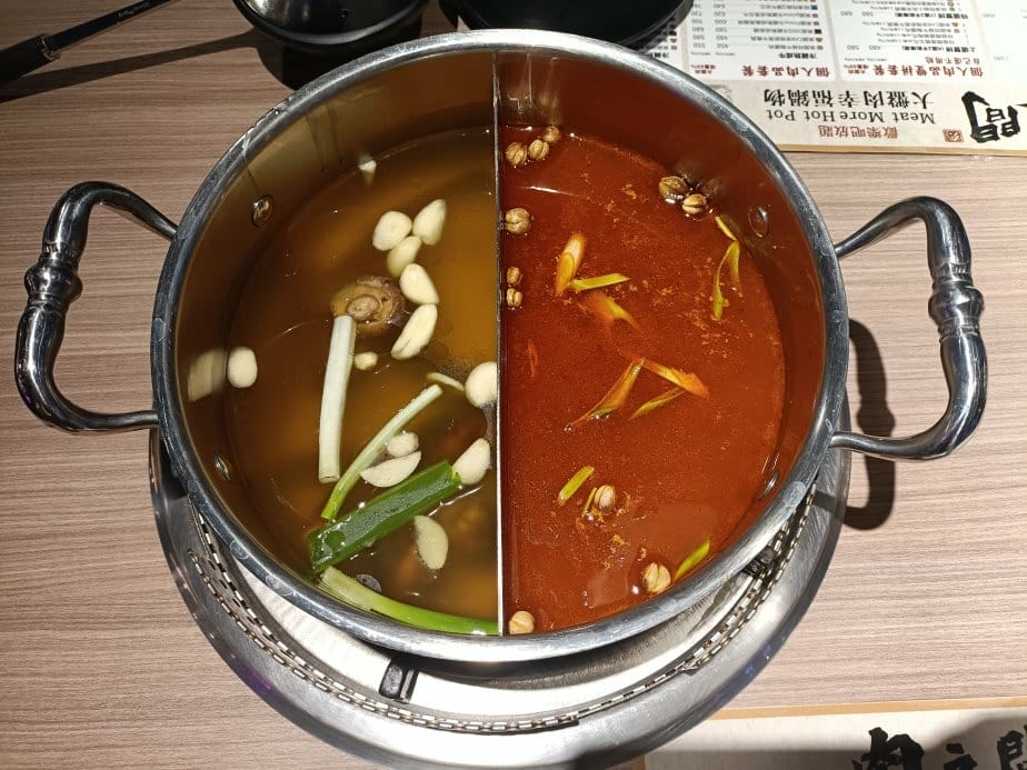 台中美食|岩漿火鍋-台中公益店。膠原鈣骨湯用大骨熬煮出的乳白色湯頭、漢方麻辣湯底鴨血、豆腐可免費續加!湯可喝!