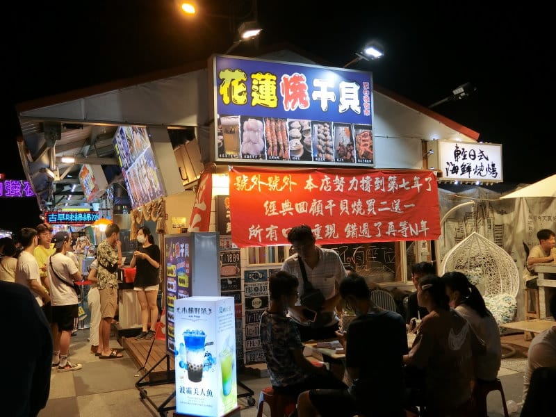 花蓮東大門夜市 攤位是我看過最多的一個夜市 暑假+報復性旅行 整個夜市的人滿到溢出來… 不過要怎麼排的再長 我今天一定要吃到這家燒干貝! 不為什麼! 就為了這句「通通50元」 燒干貝有11…
