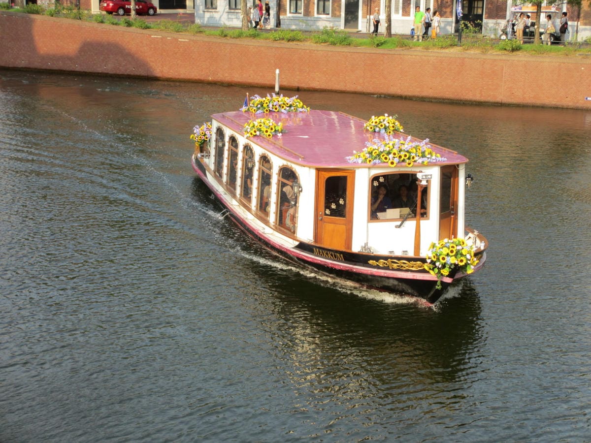 在飯店稍稍休息一個小時,讓大家恢復體力 我們從飯店走路到搭船處約10-15分鐘 船來啦~ 吼~~~連船都那麼浪漫…. 船艙的內部是原木色系 左右各二排的座位 因為人沒有很多的關係,大家都…