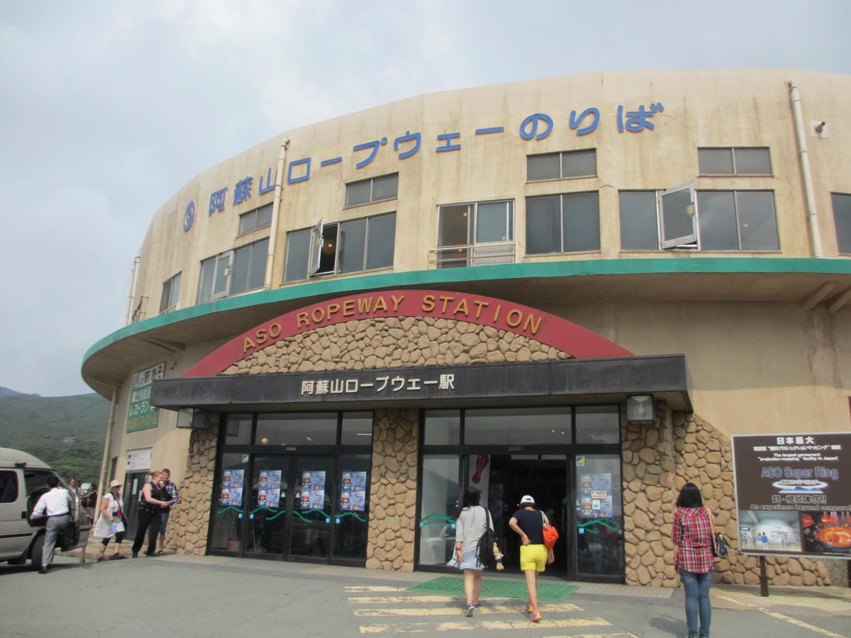 從吃完中餐到阿蘇纜車站 我們坐了約1個半小時的車程 阿蘇纜車位置海拔較高 一下車 好~~~~涼~~~~爽喔! 溫度只有23~24度! 宜人呀! 一樓有許多紀念品、伴手禮店 是日本一貫的做風 搭乘處則是在2樓…