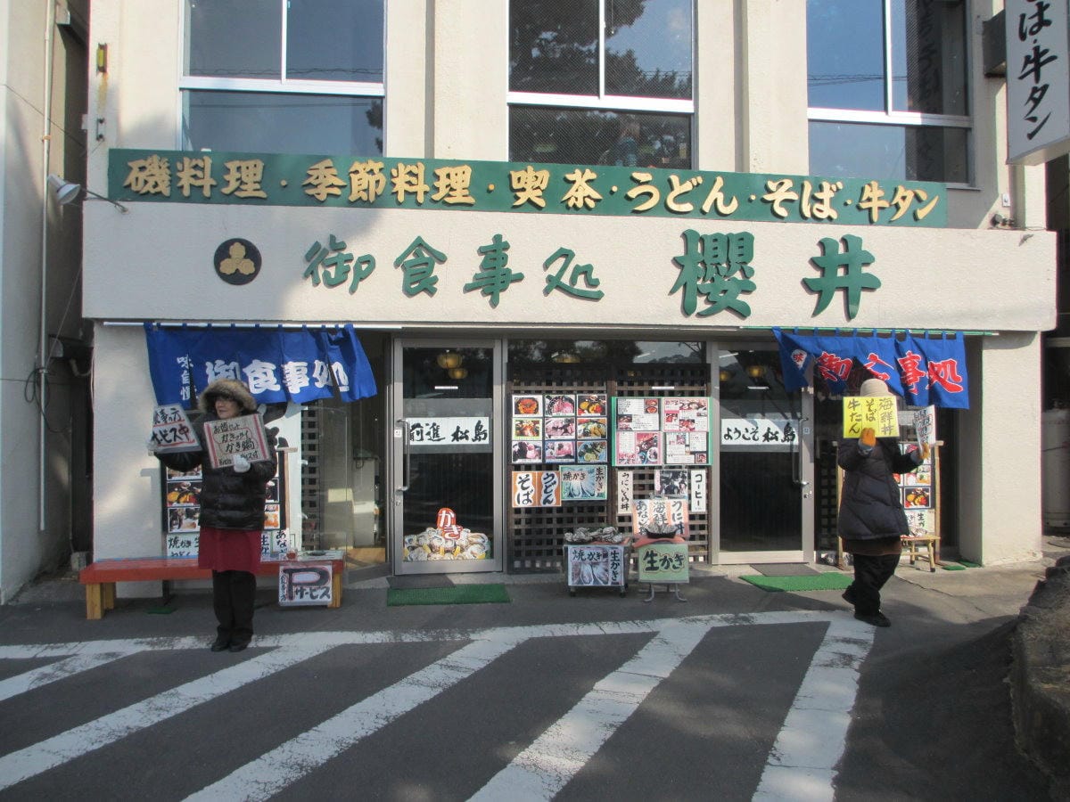 松島最有名的名物就是牡蠣啦! 今天中午吃的就是牡蠣套餐 就在這間櫻井餐廳 這些店員都好辛苦,站在外面低溫約2-3度 還有吹來陣陣海風 日幣真難賺! 餐廳的空間大小在日本餐廳來說 算是中等的 有…