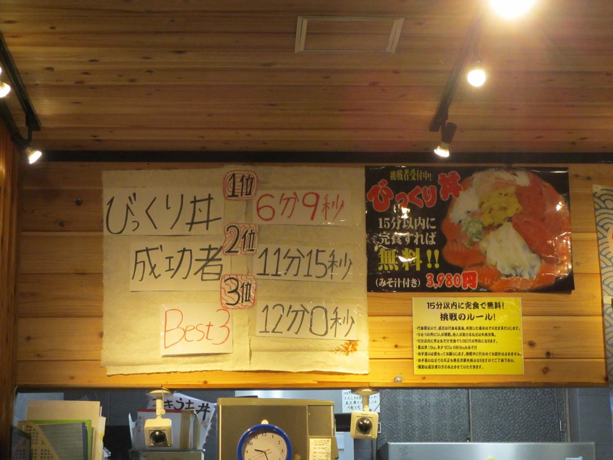 很熟悉的場面吧?! 今天晚餐我們又來到若狹家海鮮丼飯 看看這個超大無敵海鮮丼飯 15分鐘內吃完免費! 吃完就要付3980日圓(約台幣1200) 本店目前有三位挑戰者第一 歡迎來自台灣大胃王的你來挑戰…