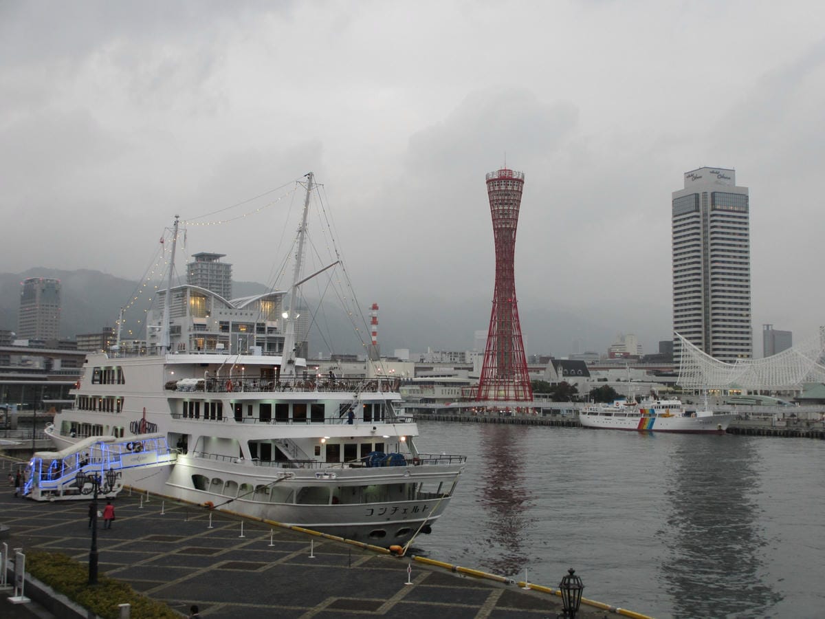 美麗的神戶港 纖茹對它不陌生 這已經是我第三次來這裡囉~ 雖然託大姐這個雨后的福 整個天空灰濛濛 不幸中的大幸是只起淡淡的霧 還可以清楚的看見神戶塔 大姐輕輕鬆鬆就把神戶塔給托住囉! 哈~…