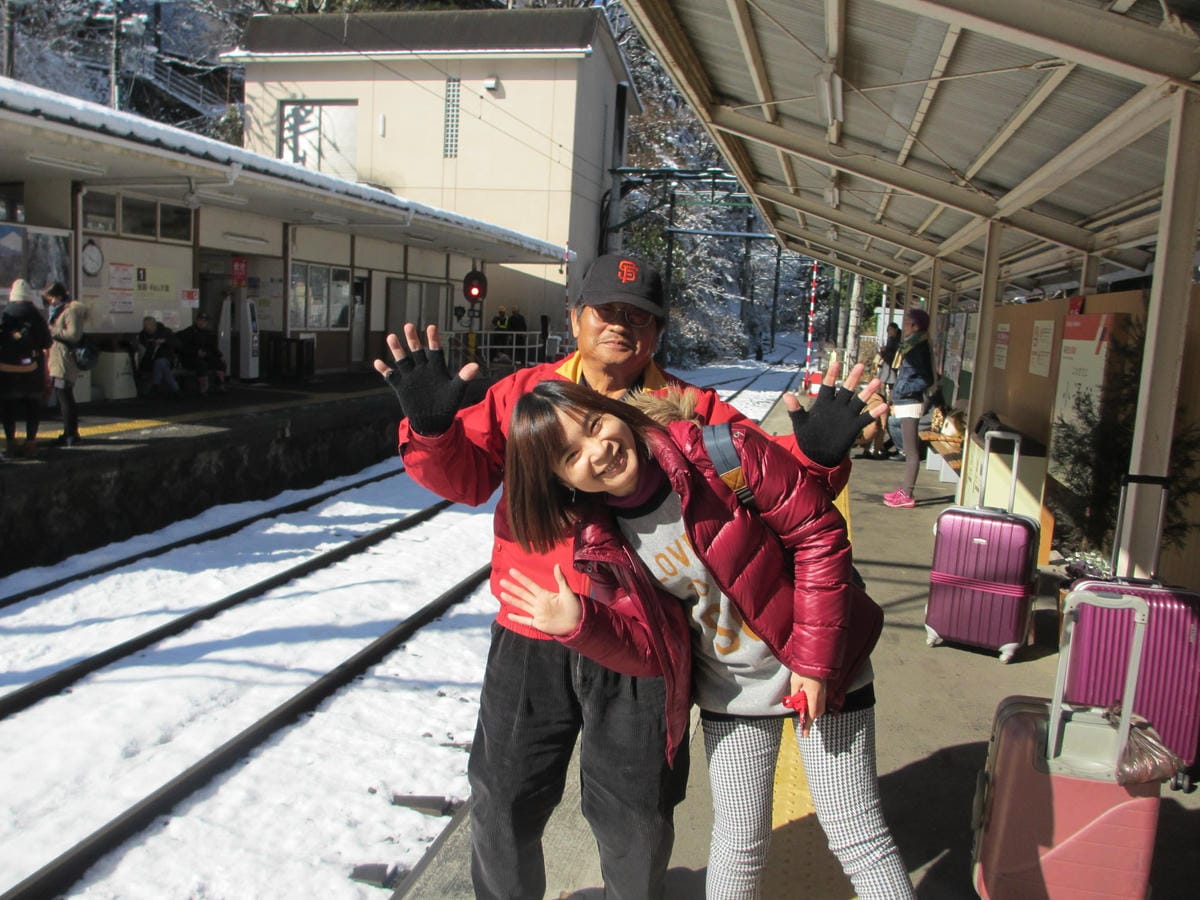 大家早喔! 我們又回到小涌谷車站囉! 昨天下午一直到今天早上 一路吃的好、泡的好、睡的好 大家的的精神也超好! 鐵軌還有昨日的殘雪 今天的天氣可是太陽大到眼睛都睜不開呢! 報告、報告! 這是箱…