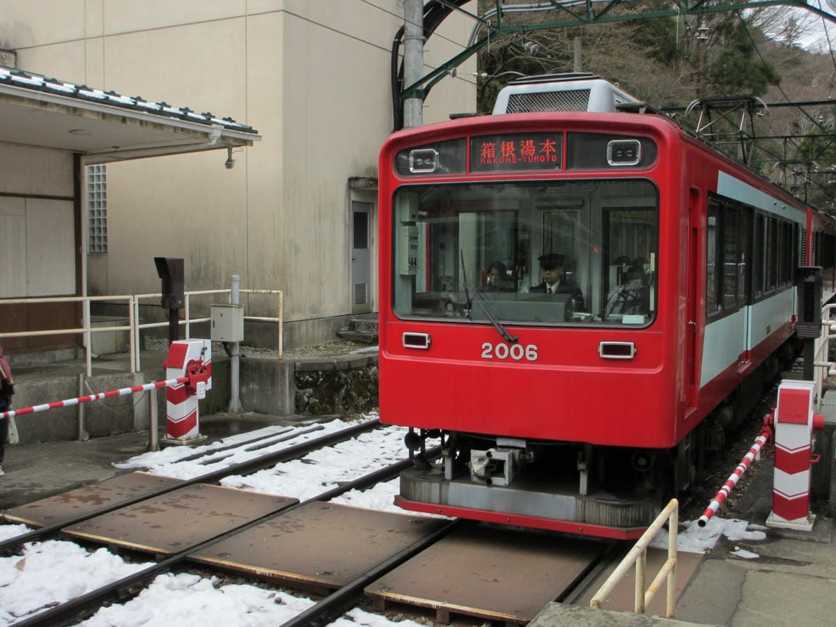 到達箱根湯本,要前往今天住宿的水之音 搭登山車是最方便了 下車同一月台直接跳上車就行啦! 看著鐵軌上的殘雪… 前幾天東京下雪~箱根肯定也是大雪紛飛 小小的登山車永遠都是滿滿的人 大家…