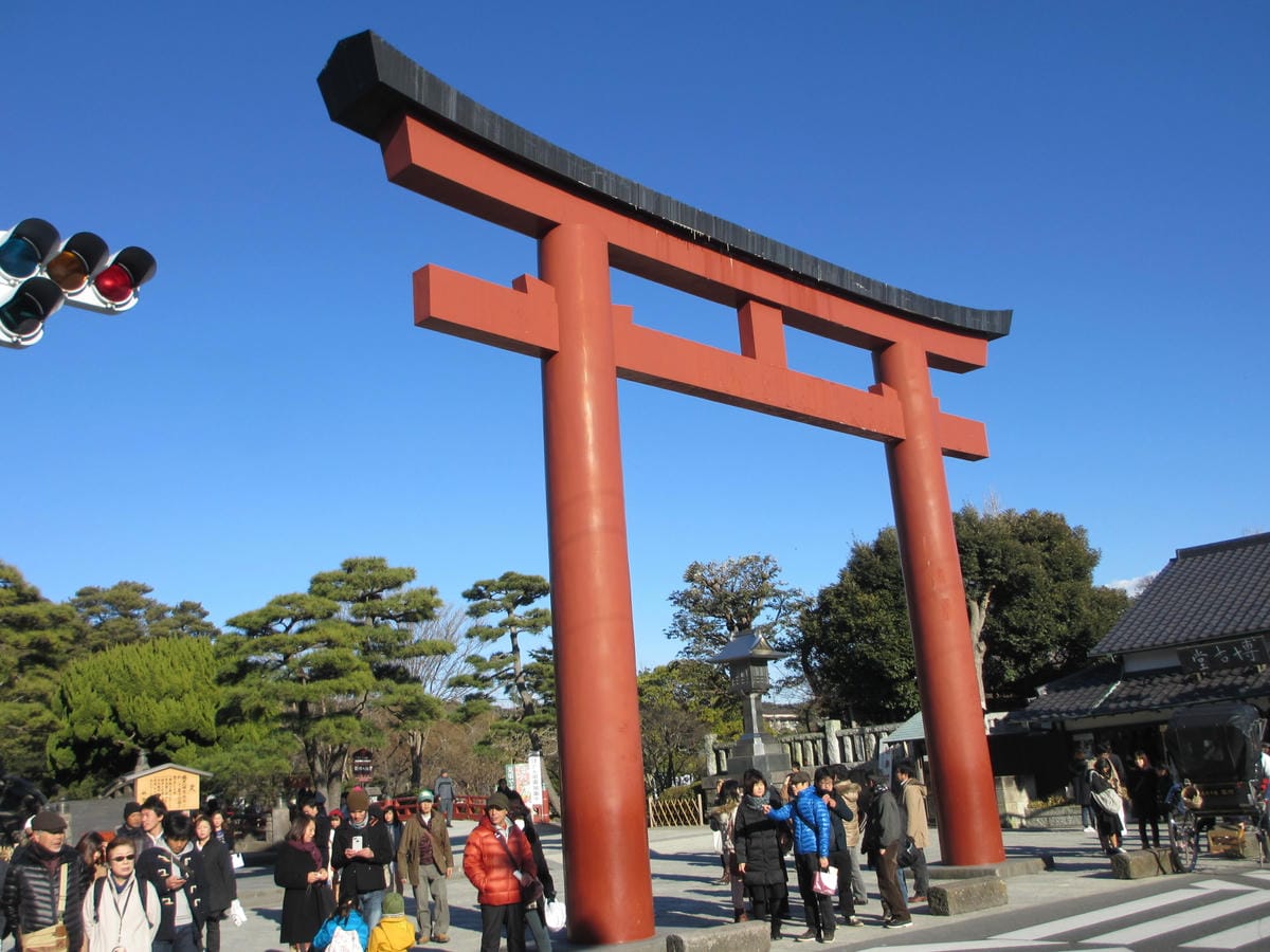 順著小町通走到底 看到日本神社的代表「鳥居」 猜想鶴岡八幡宮應該就是這裡了吧? 今天不知道是什麼大日子? 鶴岡八幡宮人山人海 還未到正殿左右兩邊都有小攤販 許多人穿著和服前來 還沒到…