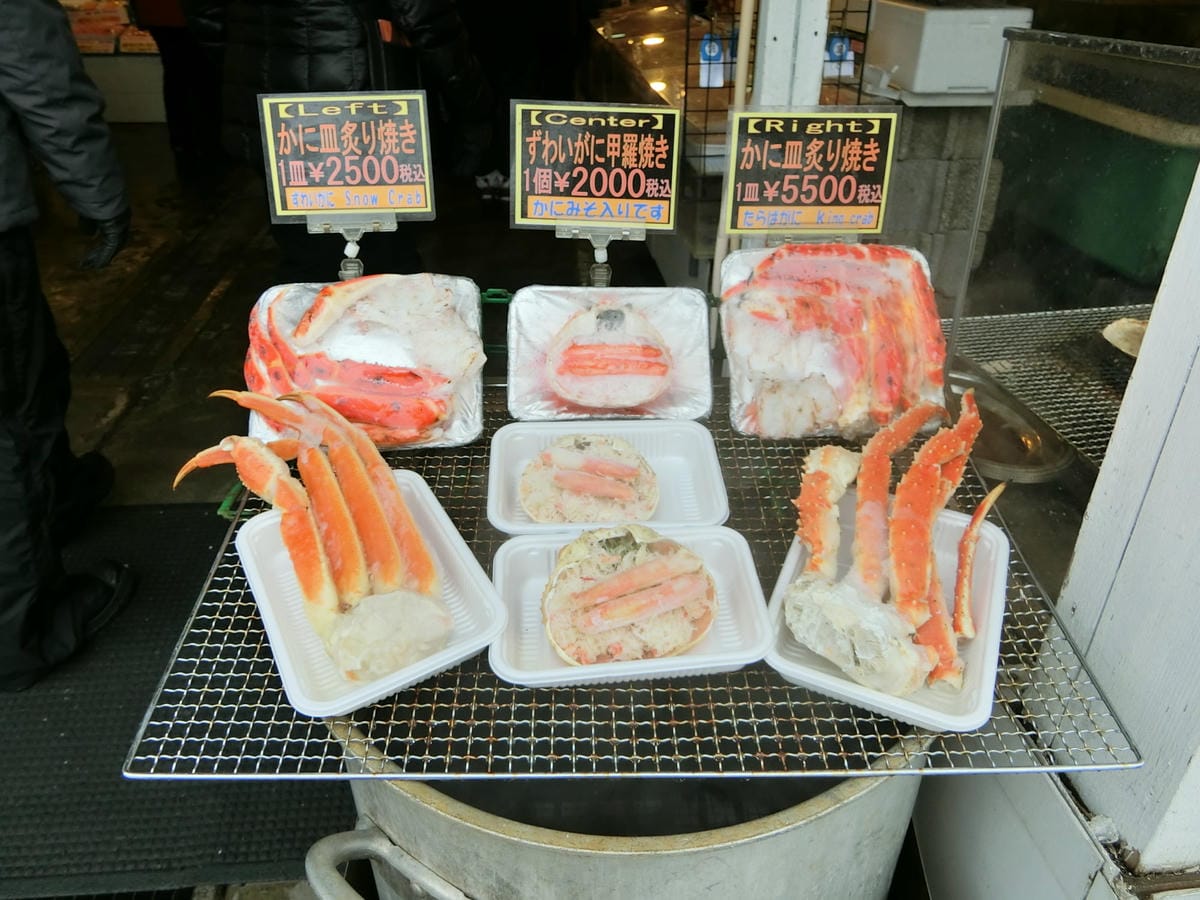 小樽真的是一個超迷人的地方 不愧有海產之國的稱號 超大帝王蟹 愛吃腳的有腳、愛吃身體的有身體 價錢從2000日圓~5500日圓不等 手掌般大的牡蠣800日圓 超大尺寸帆立貝1000日圓 全部都還活跳跳!…