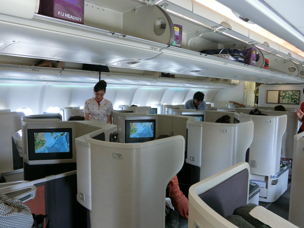 飛機感覺很新喔! 機艙有挑高的感覺 此次搭乘的是A330-300機型 1-2-1的商務艙座位設計 阿姨幫我們3人選位皆為靠窗 靠窗的的好處就是可以欣賞窗外景色 商務艙靠窗的座位 一個座位可以擁有2個窗戶…