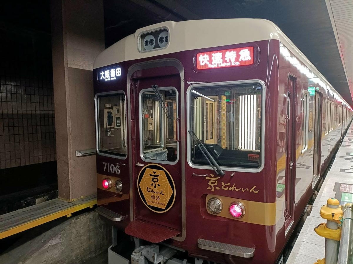 今天來去京都! 要來搭阪急京都線「大阪梅田~京都河原町」 最火紅的和風現代列車「京TRAIN雅洛」 想要搭乘雅洛號要注意喔~ 雅洛號只有六、日和國定假日有行駛,平日是搭不到的喔! (圖片截取是…