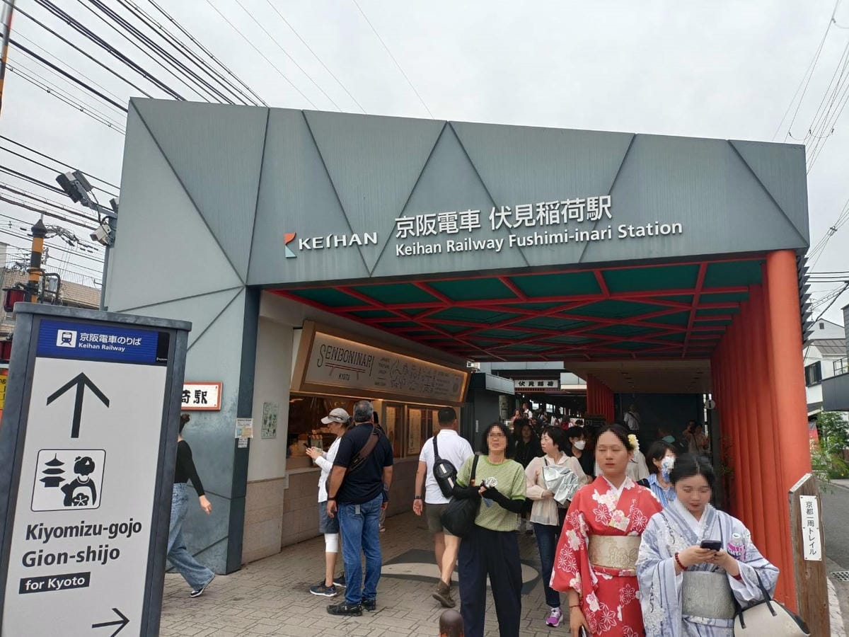 吃完甜點~下一站要去哪裡呢? 學妹說要去有很多很多鳥居的地方~ 明白、明白~ 說的就是伏見稻荷大社 從八坂神社要到伏見稻荷非常的方便 只要搭京阪本線從「祇園四条」到「伏見稻荷」 橘紅色系加…