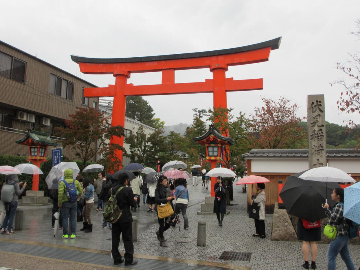 從嵐山到伏見稻荷大社 搭JR線嵯峨嵐山-JR京都-JR稻荷站下車 (沒有直達車,必須在JR京都站站內換車,要到達JR稻荷站需搭「普通」車) 出站即到! 好不容易短暫的停雨 來到伏見稻荷大社又下起綿綿…