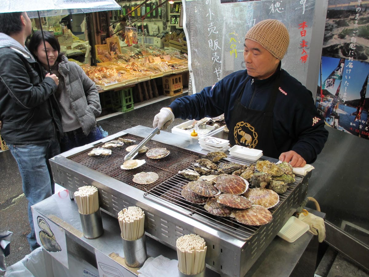 吃完壽司清握壽司套餐 繼續走走築地市場 走著、走著 看到了一攤現烤帆立貝耶! 烤牡蠣、烤帆立貝 看一樣都好好吃喔! 一顆現烤的帆立貝才500日圓 走過路過千萬不要錯過! 是不是很肥美呢? 這種…