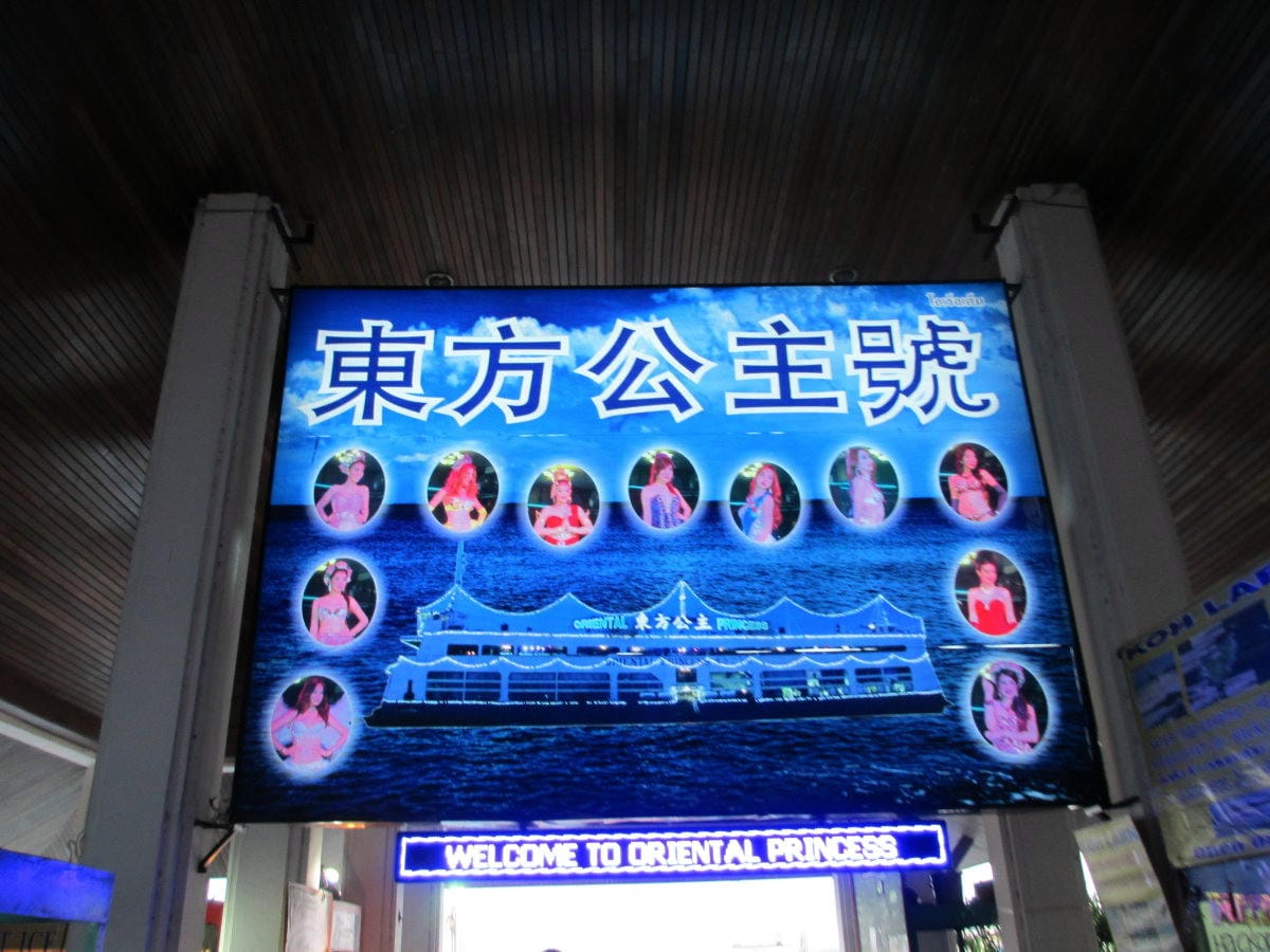 時間過的真快~ 我們又到了要吃晚餐的時間了! 天呀~我的肚子還很飽…真的是吃不下呀~ 今天要在船上吃海鮮 但不是照片中的這台「東方公主」號喔~ 要搭船就一定要到碼頭搭船 這裡就是芭達雅…