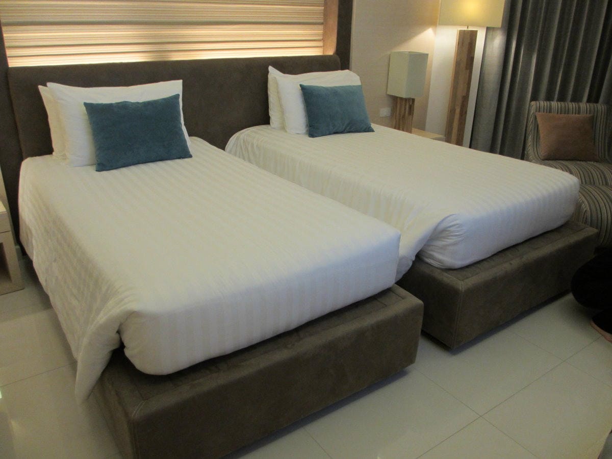 吃完晚餐看完秀~ 終於可以回飯店休息了! 我的媽呀~一整天下來好累喔… 但一進房間纖茹整個人就大復活啦! 不愧是我精挑細選的房間呀~ 風格就是我要的~對味喔! 加大單人床一人一張,半夜就…