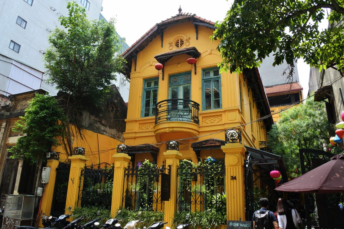 顯眼黃色法式浪漫建築物 今天中午用餐的地方 遇見“家”HOME MOC餐廳 越南北方風味料理 戶外用餐區 浪漫嗎?非常浪漫~ 有氣氛嗎?非常有氣氛~ 但是!!! 別忘了夏季的北越溼度高,悶爆了! 狹長挑高…