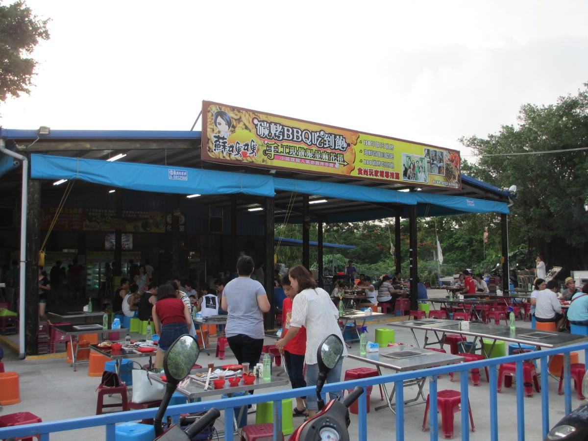 天還亮著~卻已經是晚上6點了! 我們騎車聞香而來~ 來到「蘇媽媽BBQ吃到飽」 露天烤肉耶~! 好久沒有這種感覺了 大家一起烤肉 一人烤人百人香! 大家可以想想這些地方都座滿了人、每一桌的煙都升起…